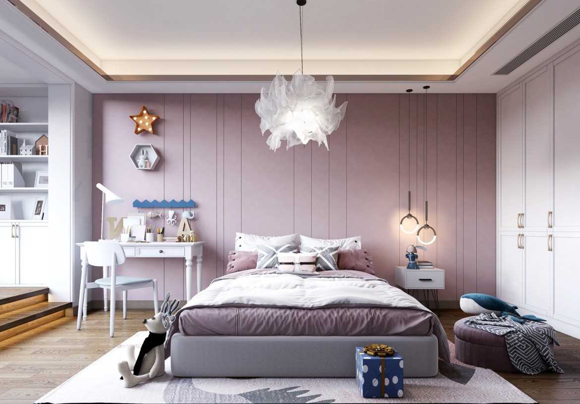 随着二胎家庭的逐渐增多,很多家庭设计了双人儿童房。房间内设置双人床,让孩子们处在相对独立的空间,非常适合睡眠习惯大相径庭的孩子。同时双人儿童房的设计,也便利于培养孩子之间的感情。